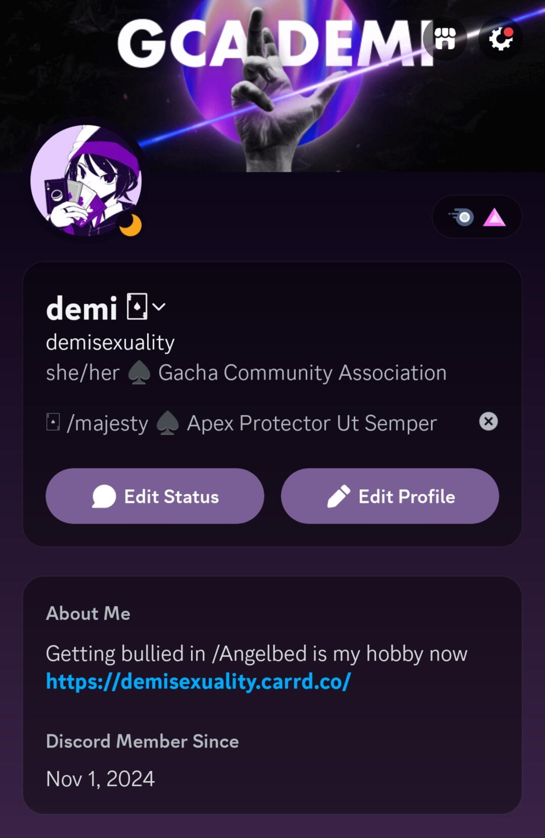 Wsg my ni I mean hello friends ^^I'm Demi aka the "I think she might be demisexual" girl. This is my GCA account so please bear with me and my harmless little larping. I'm 14, Australian time zone, n I like worldbuilding! I used to be in the Cult of Vin (ew) and STGC (okay ish) so the Gacha Community Association is my last stop and hopefully my last stop. Fun fact about me; I used to be the Foreign Affairs Minister of a micronation, also LuniDev and GoldenWind aren't very fond of me.My wives fr: harmony, loli, lulzey, littlesara, dinkie, sukillu, pandoraIf I ever get terminated just email [email protected] and ask for Demi's new Discord account!
